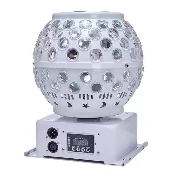 工作电压:AC220V/50Hz 产品功率:50W 光源:12颗5W灯珠 控制模式:声控,自动,DMX512,主从 特点:360度全部间照射,地面和天花板都有图案 调光方式:0~100%超平滑调光 频闪: 20次/秒 重量:2.5kg 尺寸:215mmx175mmx285mm